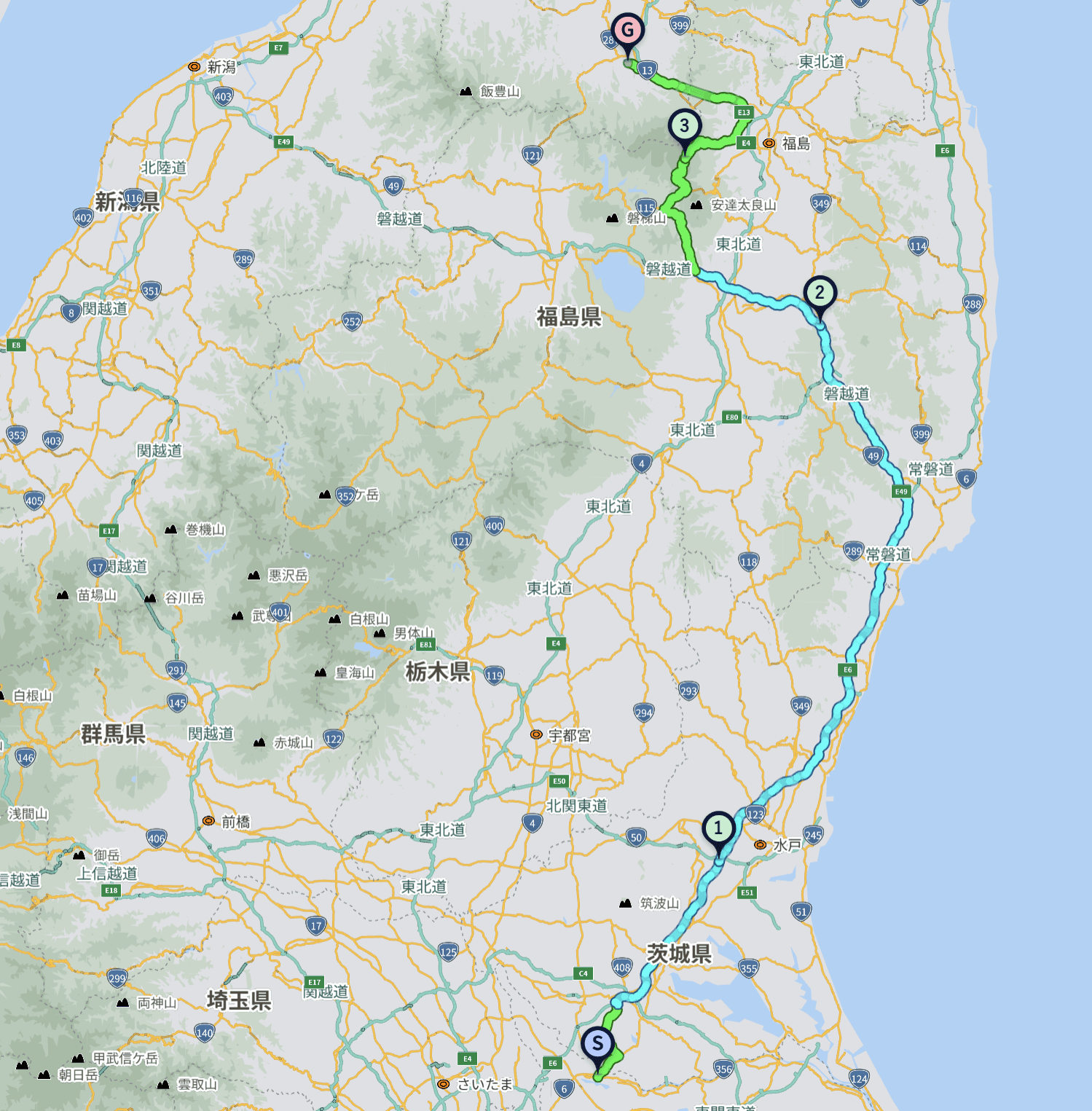 1日目:自宅 → 友部SA → 阿武隈高原SA → 磐梯吾妻スカイライン → 浄土平レストハウス → 浄土平レストハウス → ホテルベネックス米沢