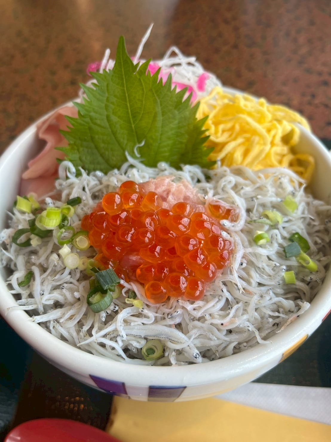 昼ご飯は、いつもの「山水」によって、釜揚げしらす丼いくら乗せを頂きました。