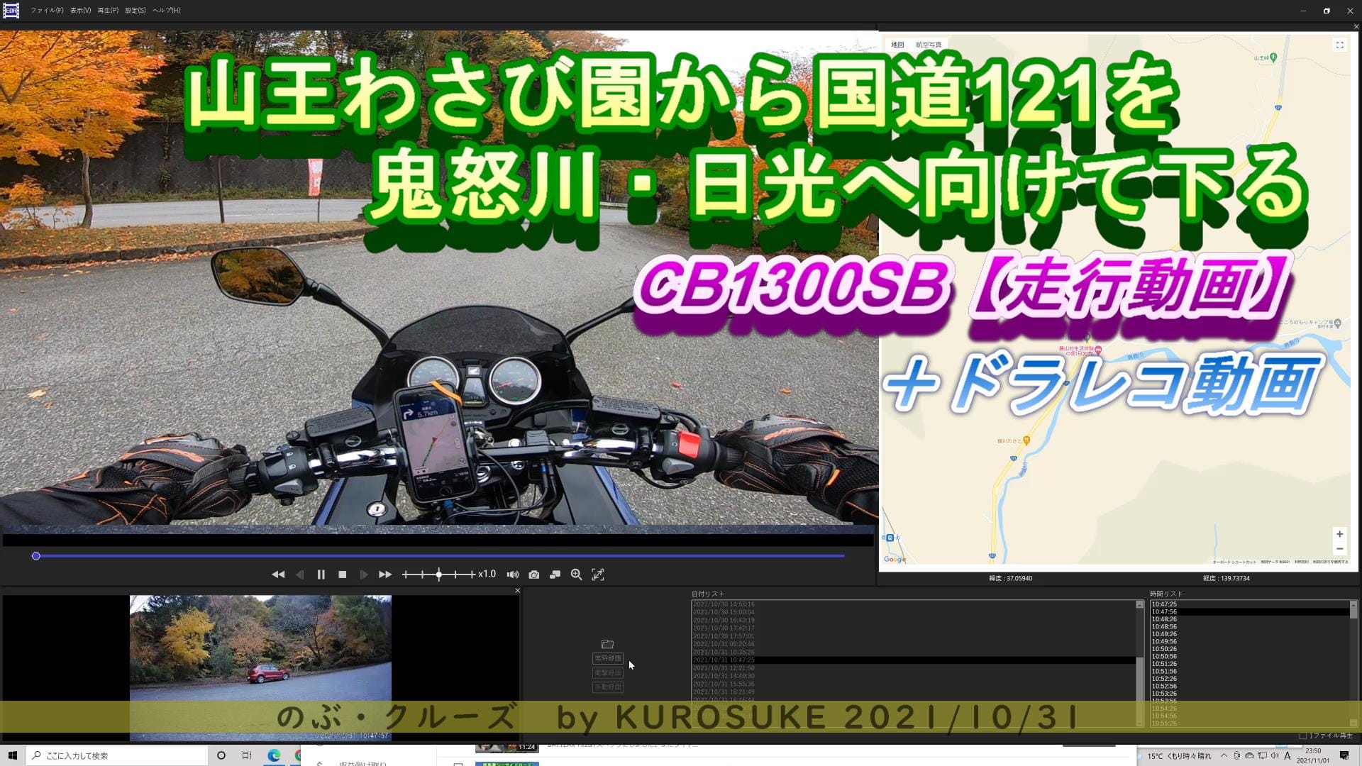 【バイク走行動画・ドラレコ(EDR-21G)】CB1300SB わさび漬けを買って素晴らしい紅葉を見ながら国道121を鬼怒川・日光へ下ります。途中の景色が素晴らしいです。ドラレコ(EDR-21G)で収録したデータをPCソフト「Moto DR Player」で再生すると、右に走行している場所をMAPで表示出来、左下には後方の動画です。いいドラレコです。今回アップして言う動画は、前方のみGoproで撮影したものに置き換えています。