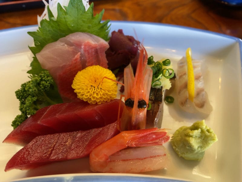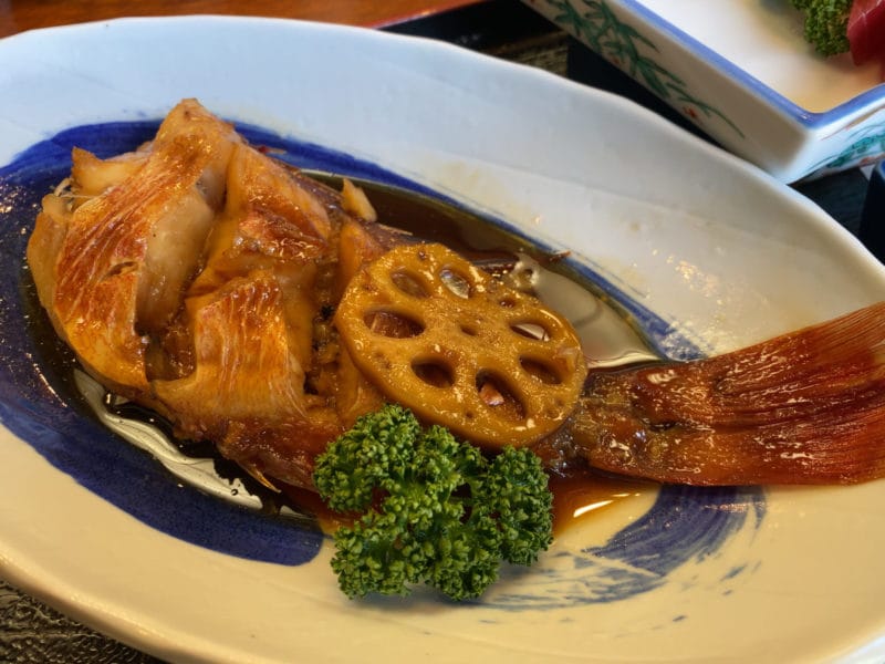 今回は常盤と言うお店で、2階の広々とした座敷の窓側に通してもらいました。頼んだのは「祭り定食」2500円也。今の季節のおすすめの赤魚の煮つけを頂きました。