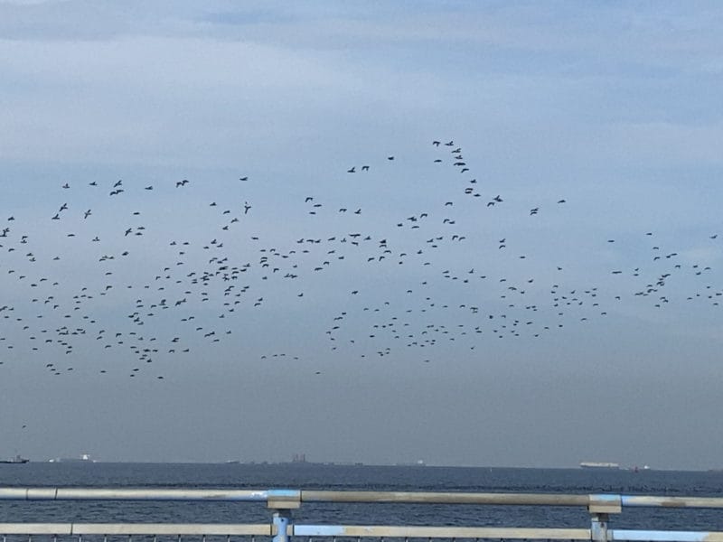 カモメ(?)、鳥が飛んでます。カモメは群れないか、、、そんなことは無いはず、、